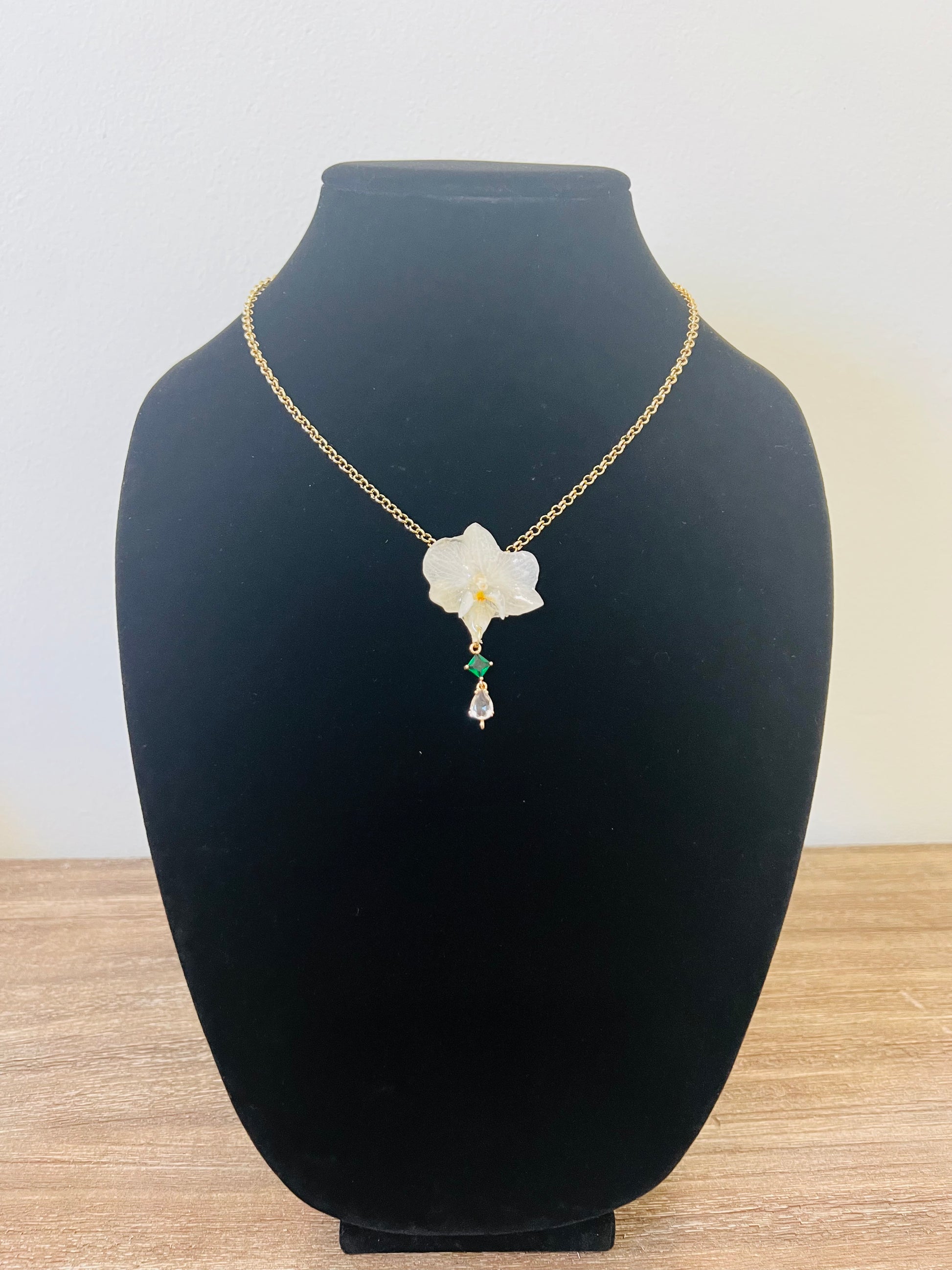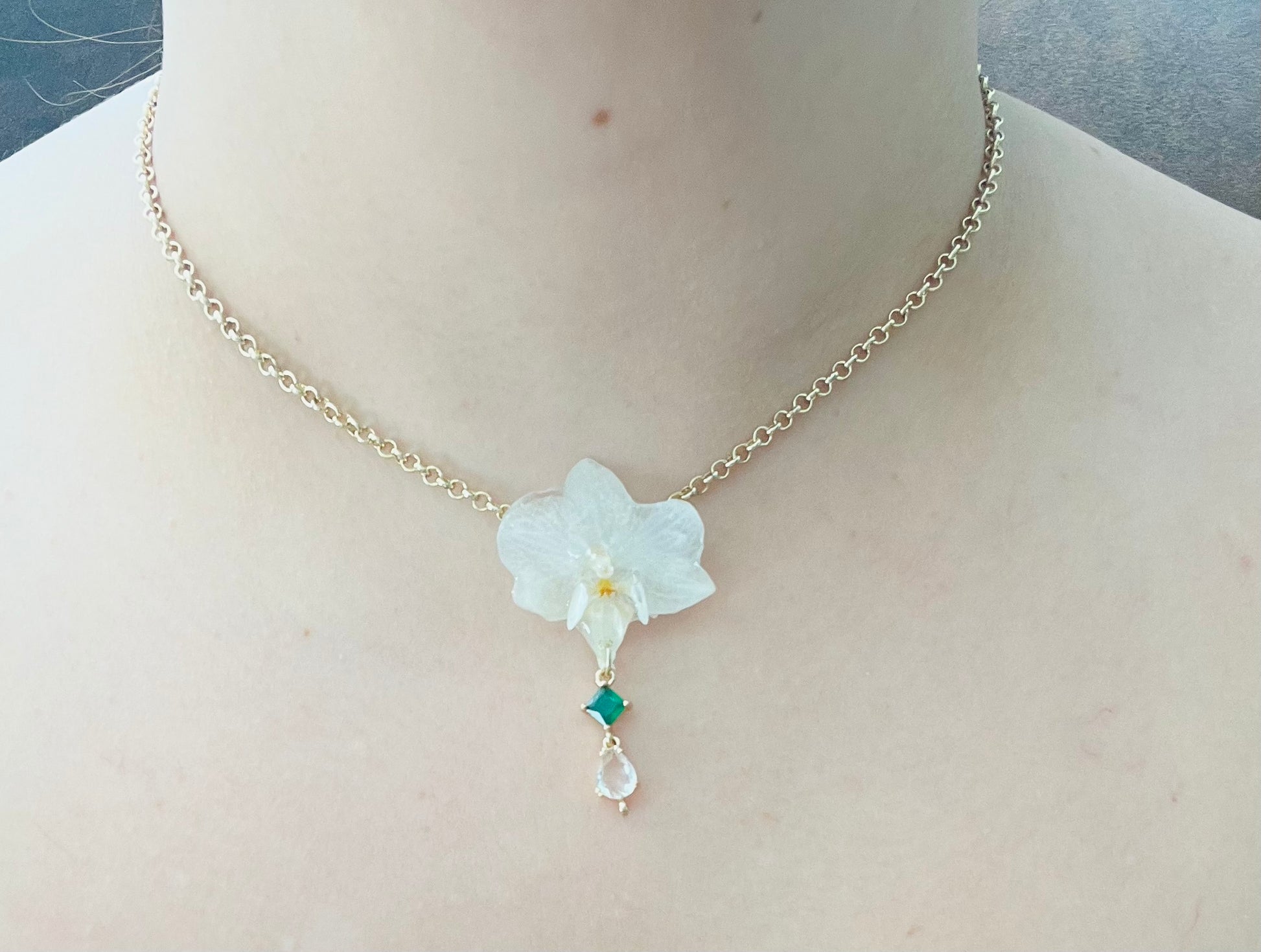 Small Orchid encapsulated in resin, on a gold-plated chain.