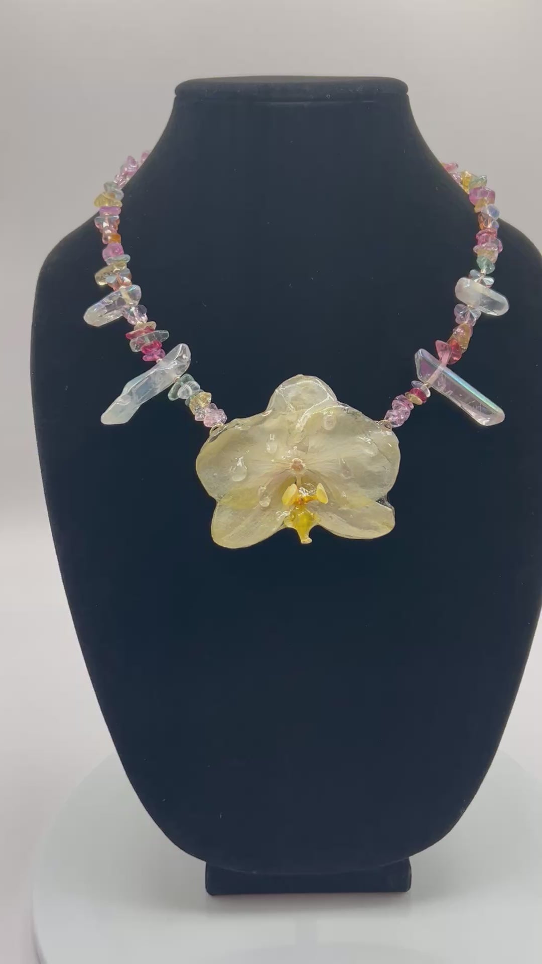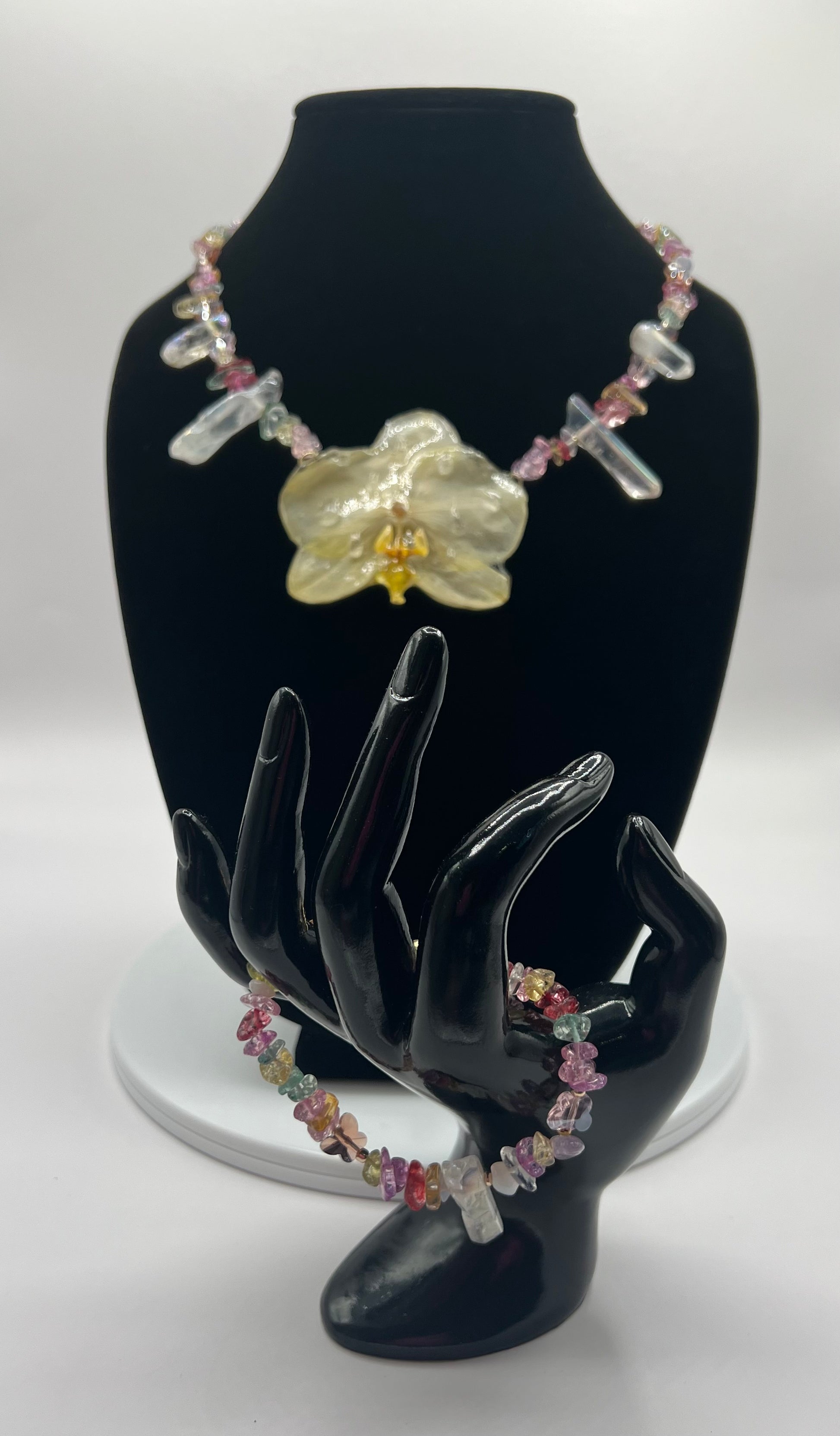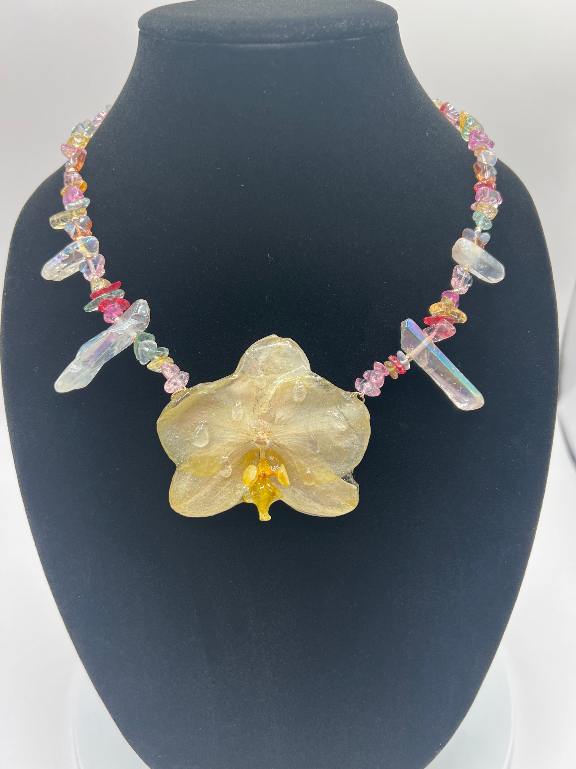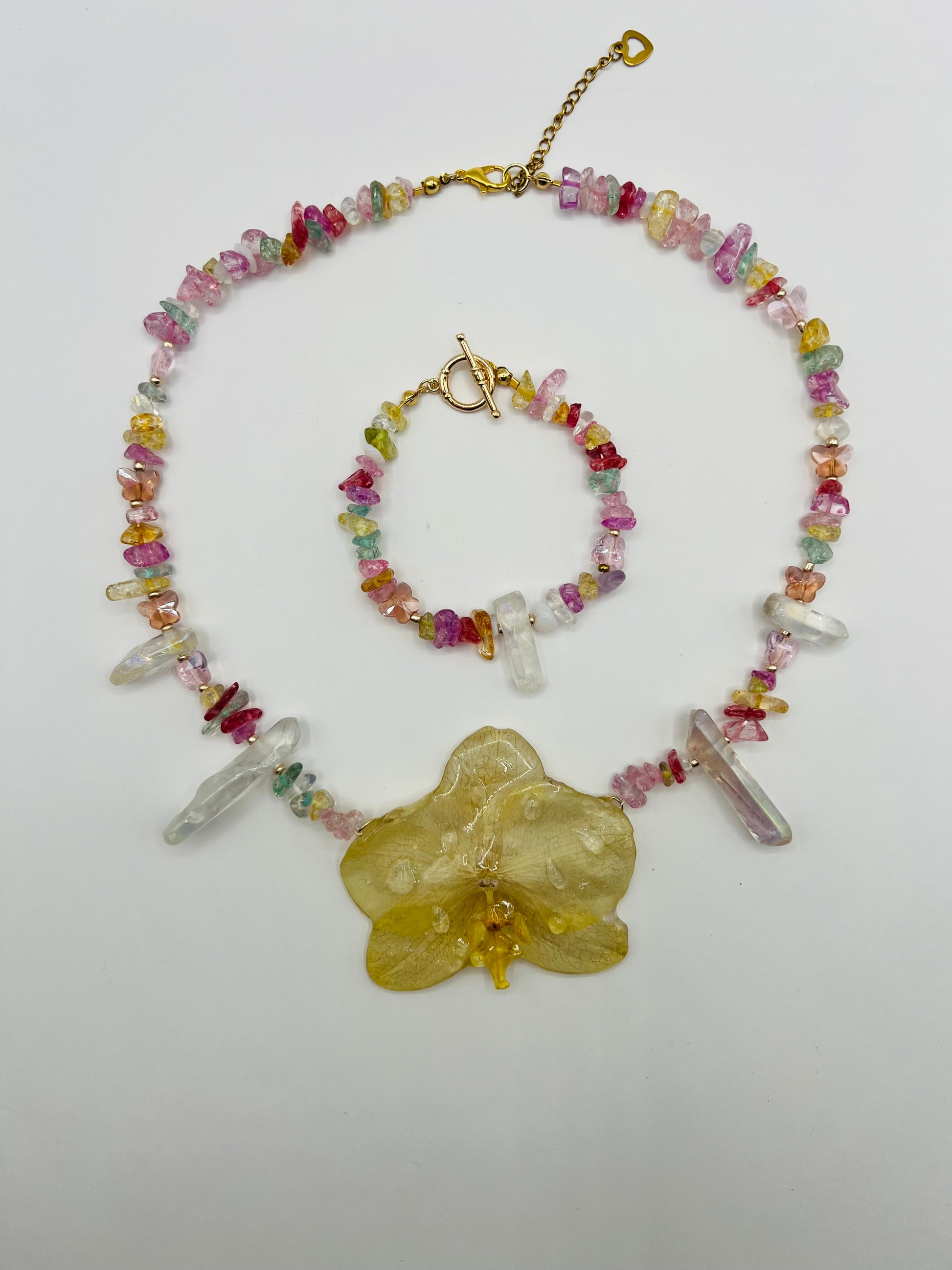 Handmade set, necklace and bracelet. Rainbow color dyed crystals and a real orchid encapsulated in resin. Perfect set for any occasion.