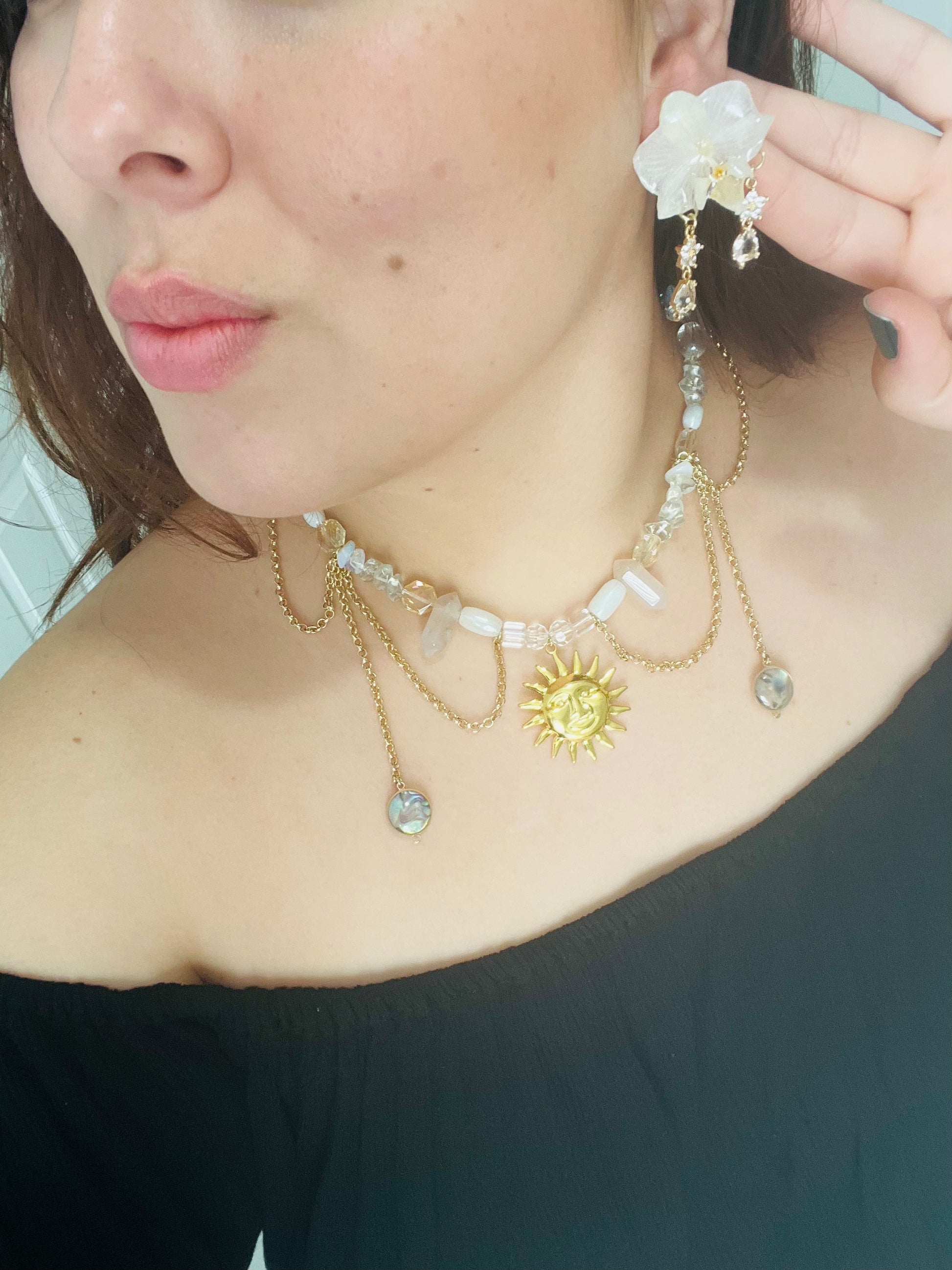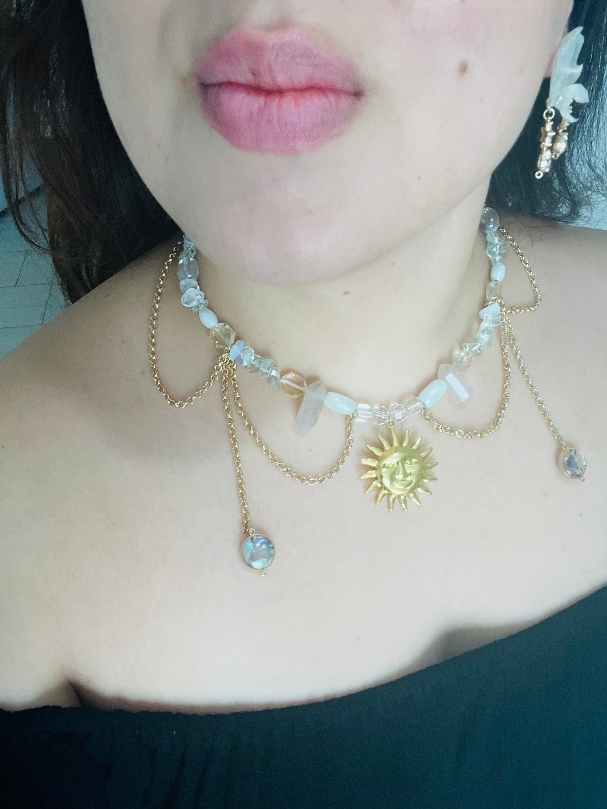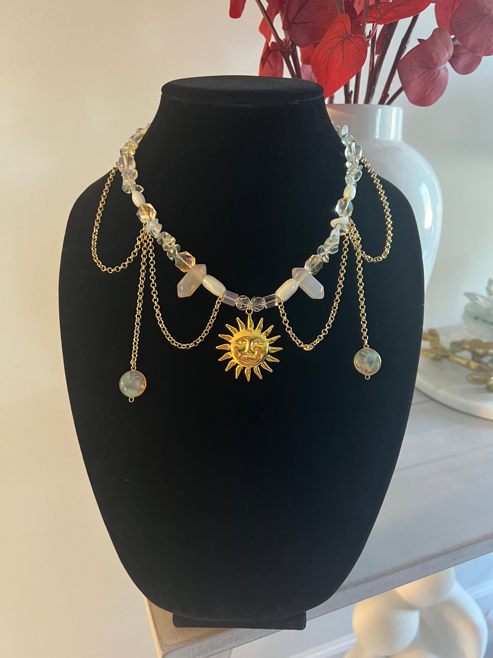 Necklace made with glass beads and two quartz with a Sun pendant.