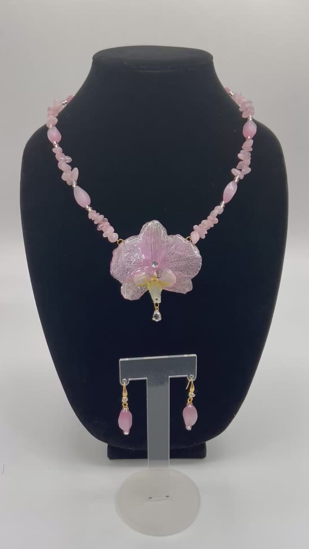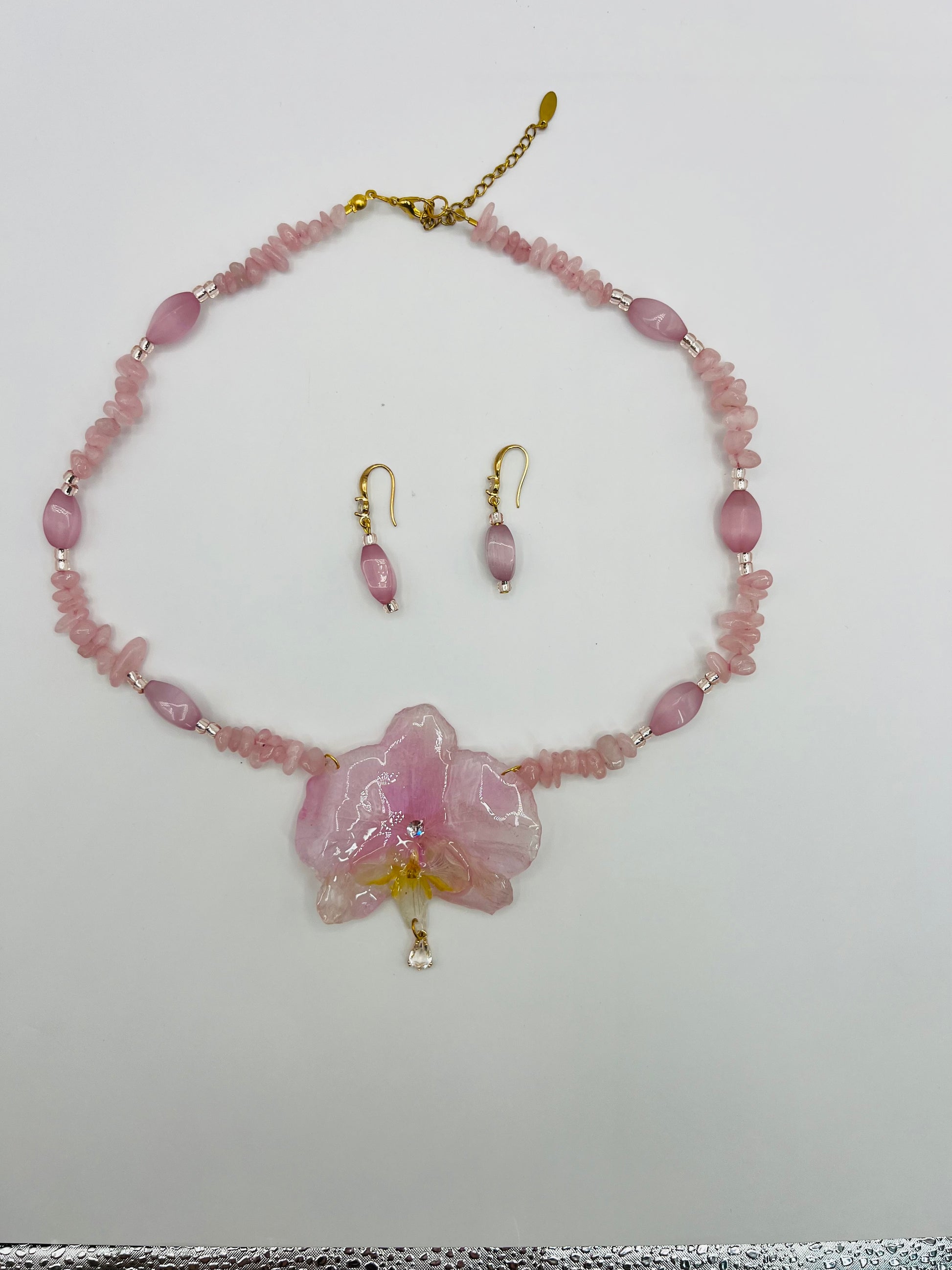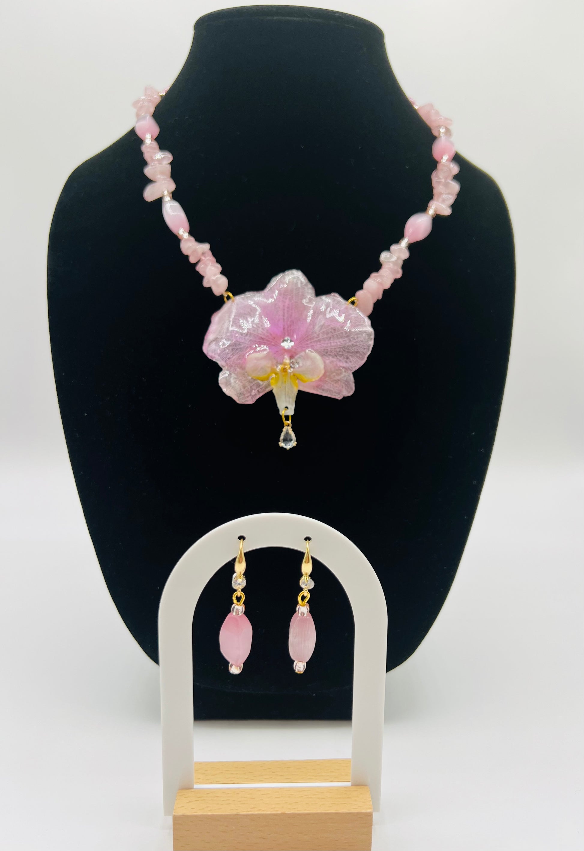 Necklace and matching earring set, crafted with Rose quartz, Glass Beads, and a real encapsulated Orchid.
