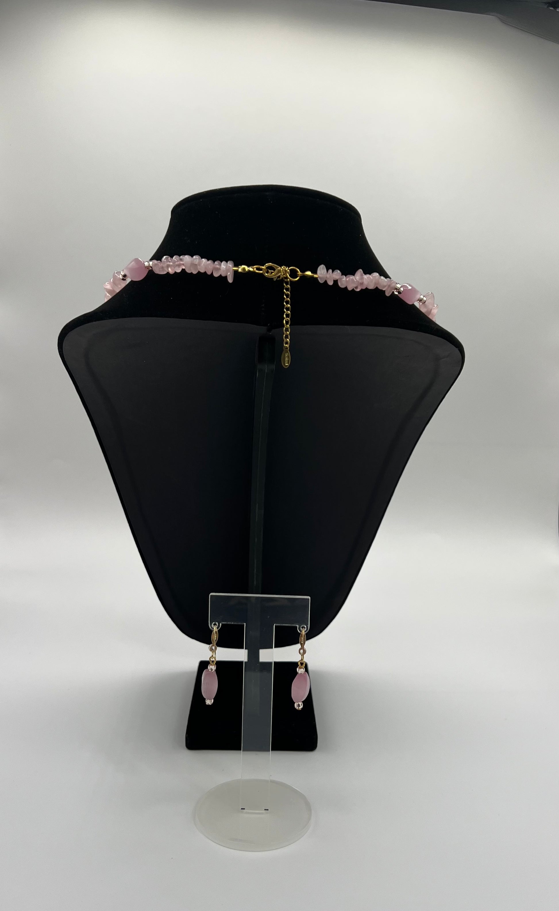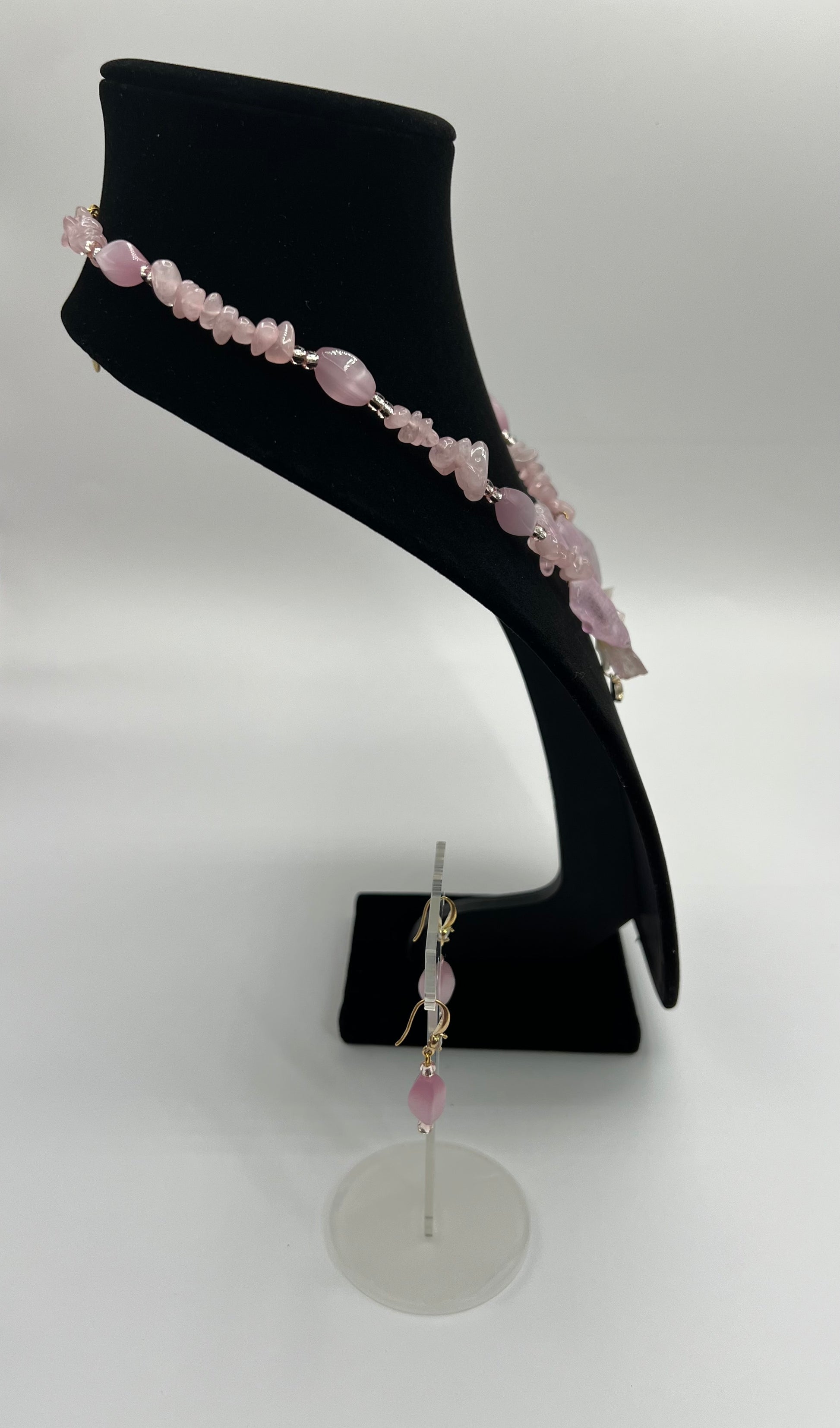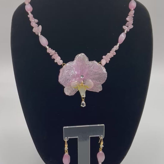 Necklace and matching earring set, crafted with Rose quartz, Glass Beads, and a real encapsulated Orchid.