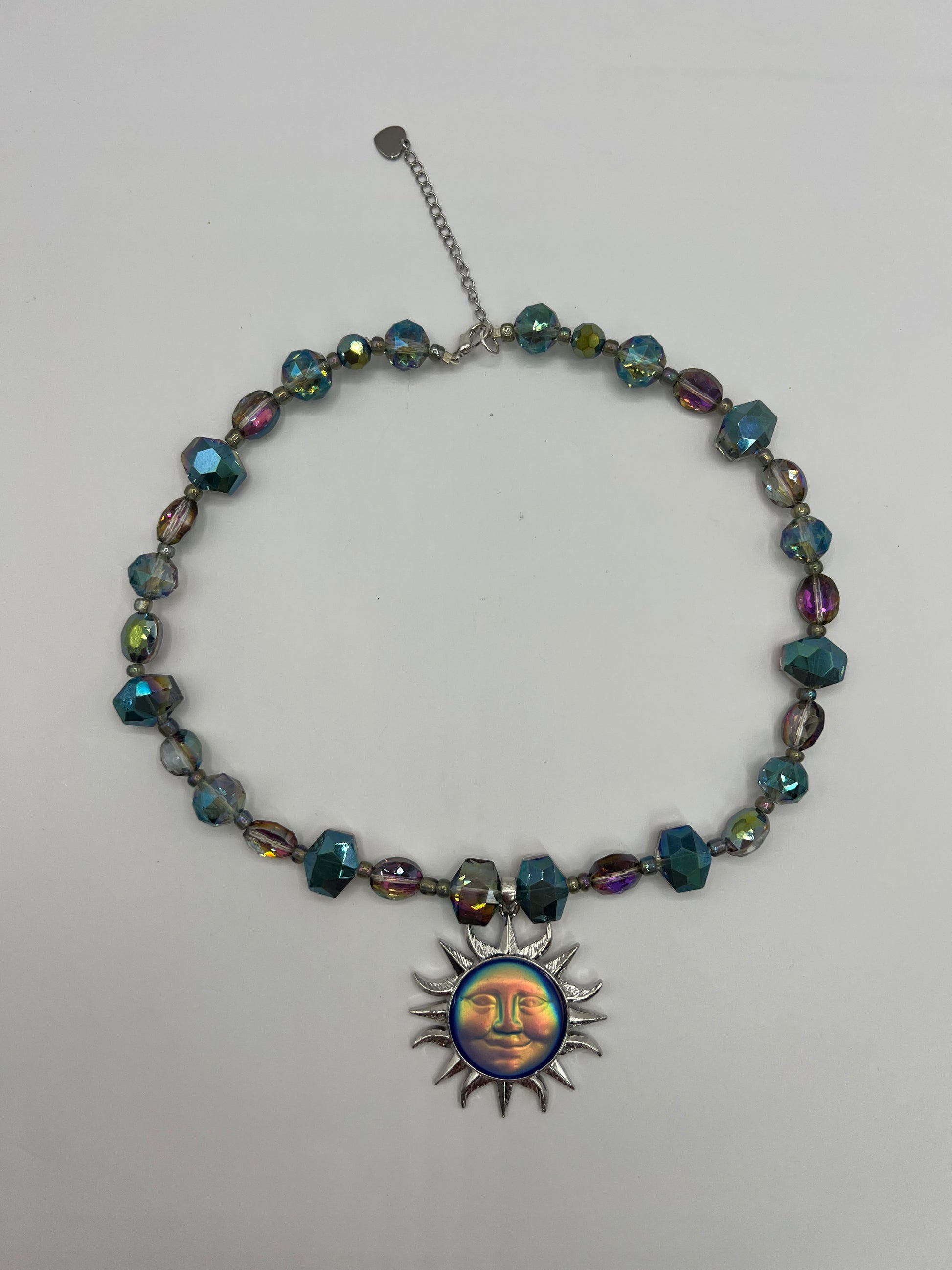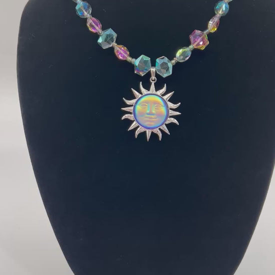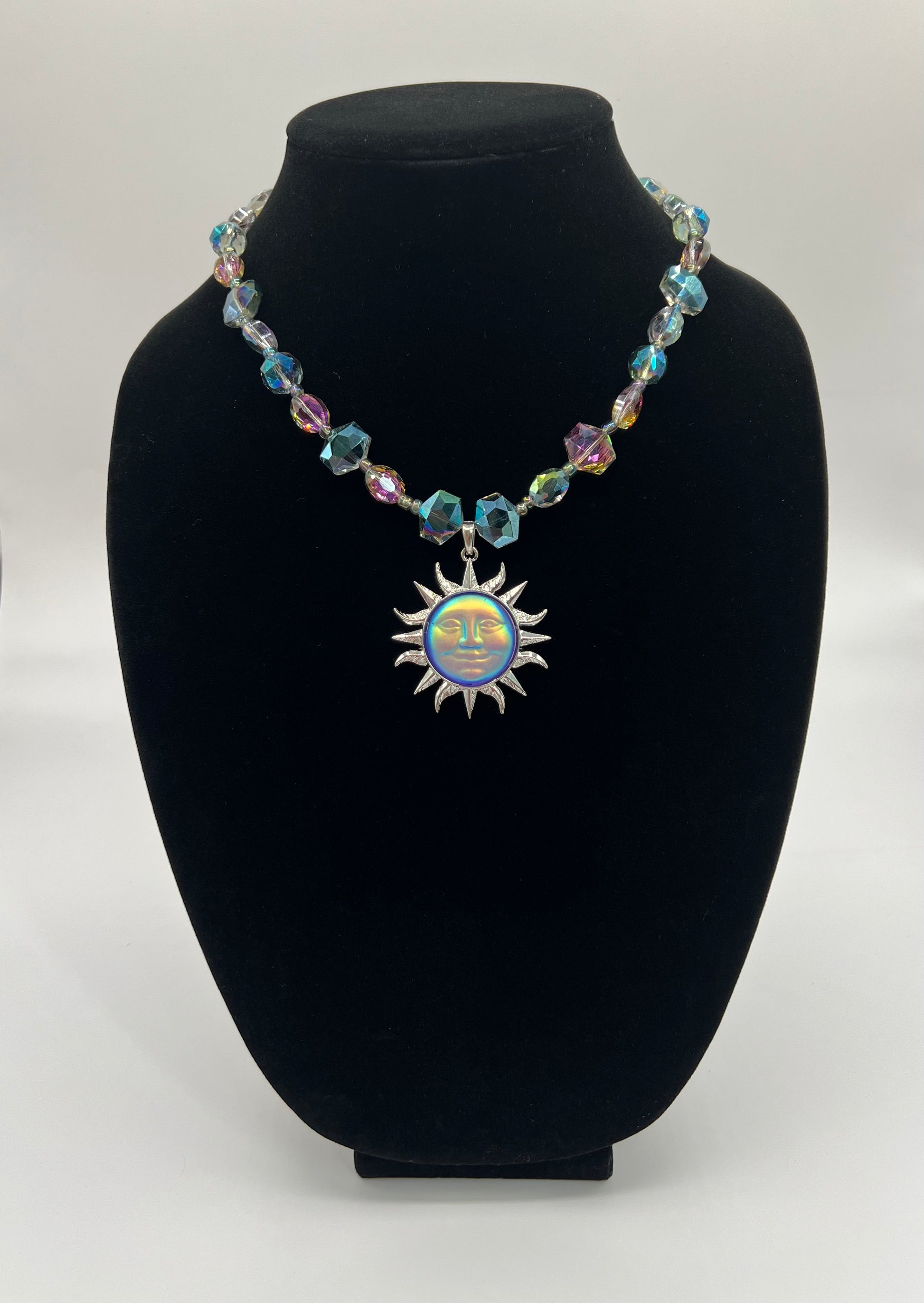 Iridescent or multicolor glass beads and a sun charm.