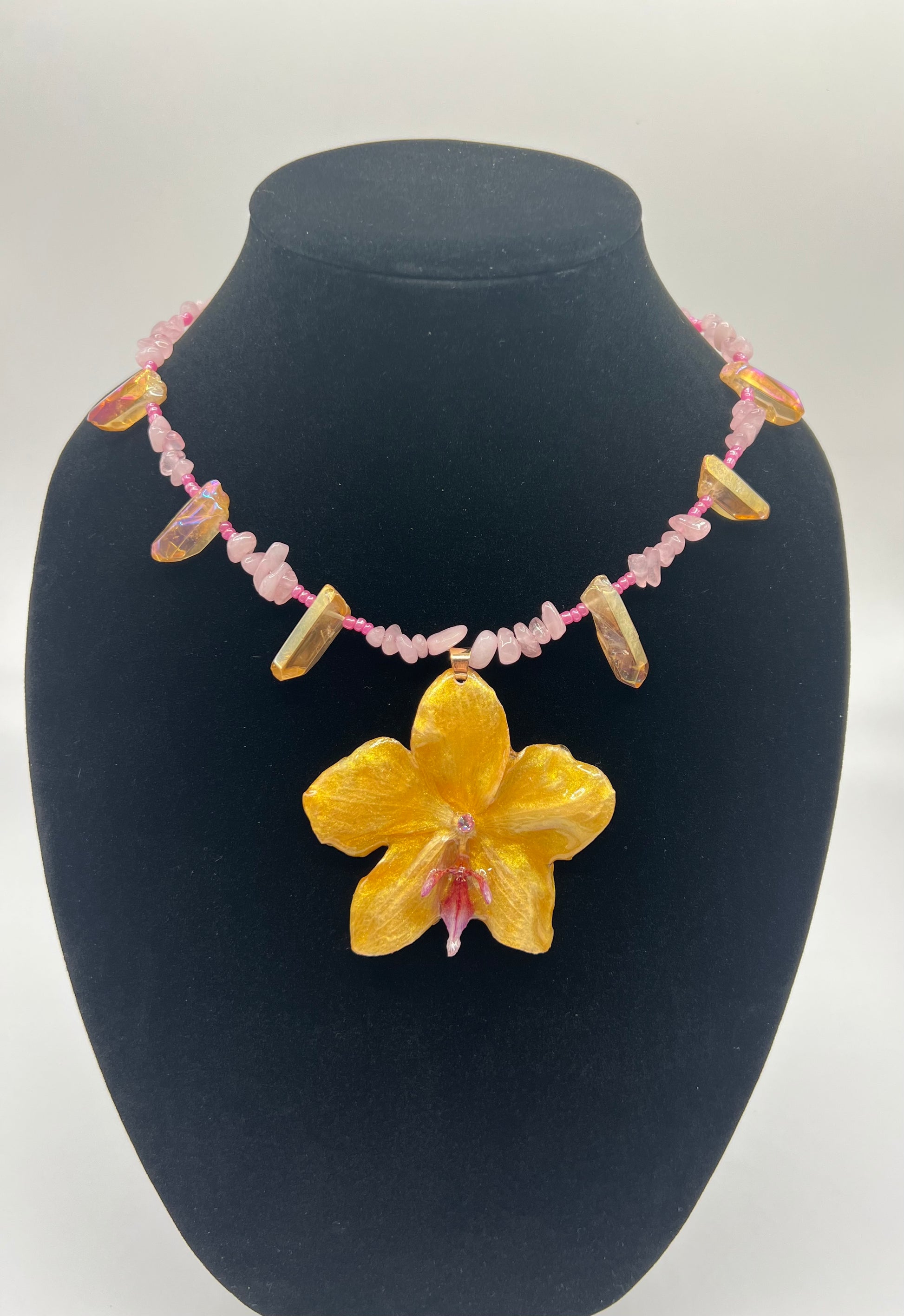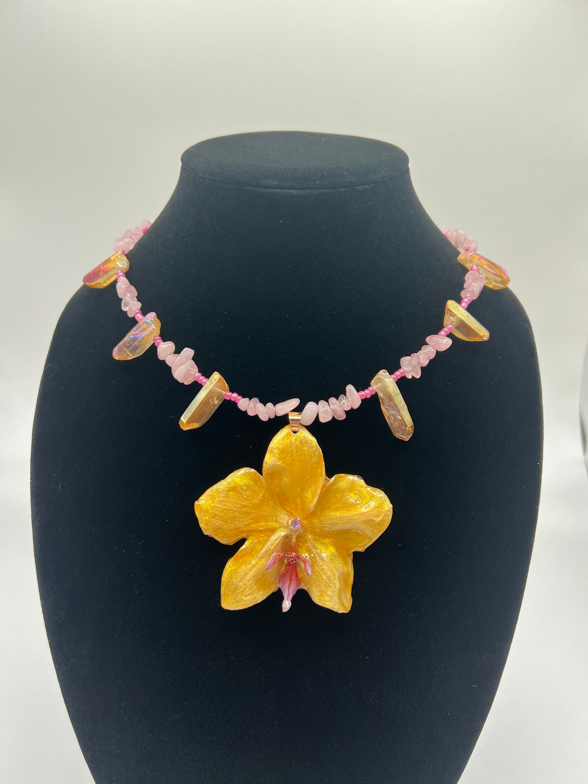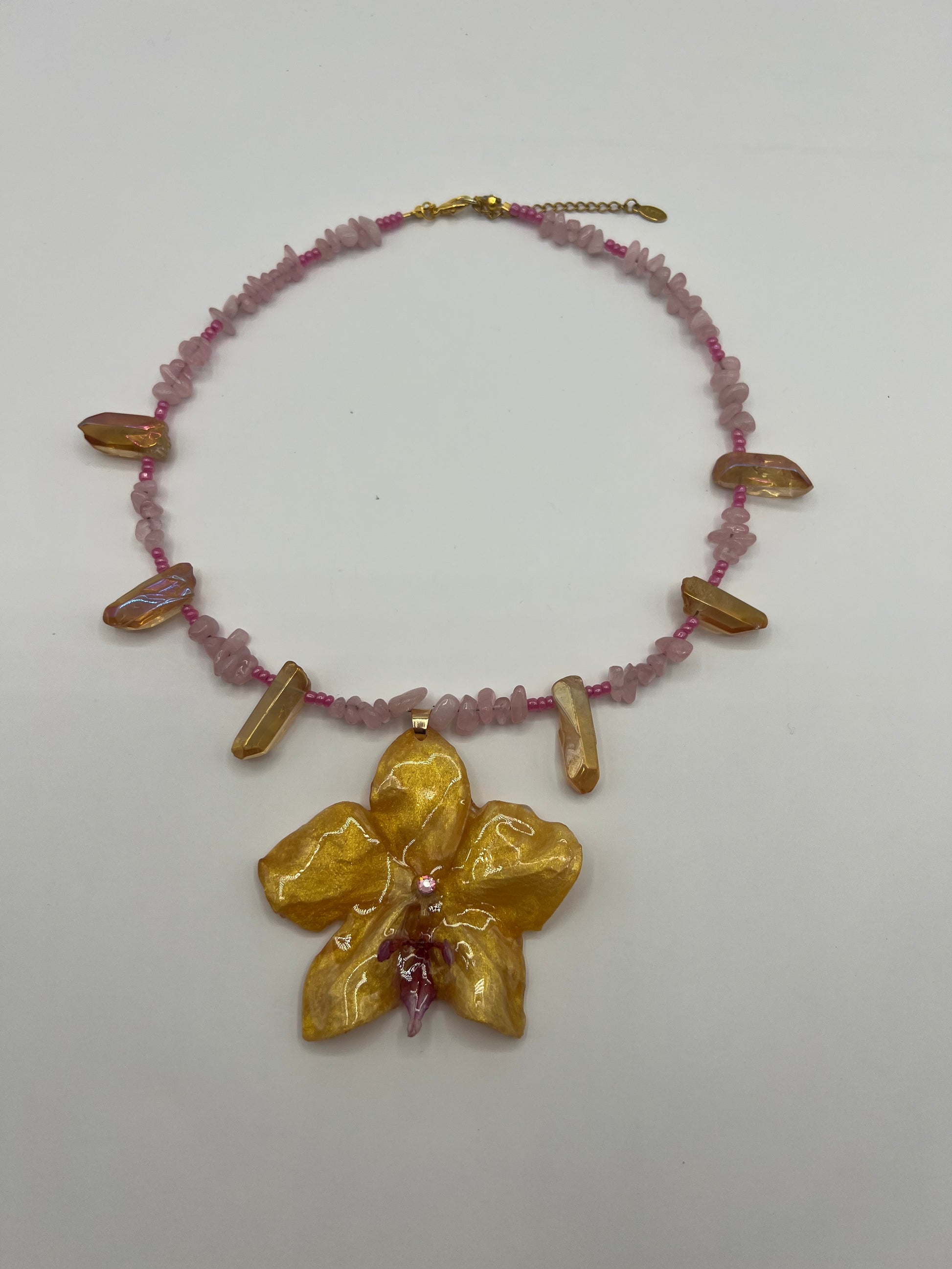 Handcrafted necklace with Rose quartz, dyed quartz, glass beads and a real encapsulated yellow orchid.