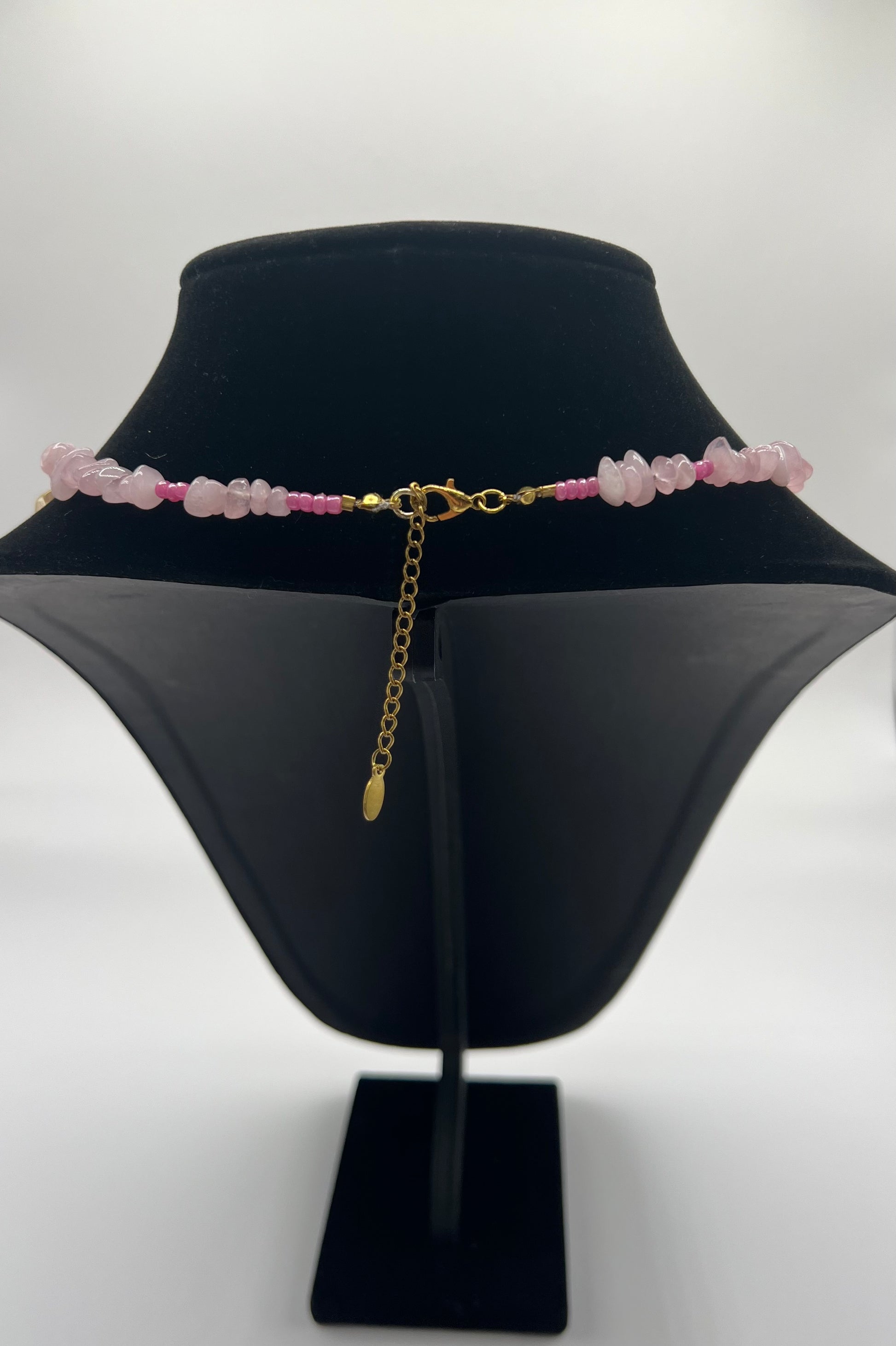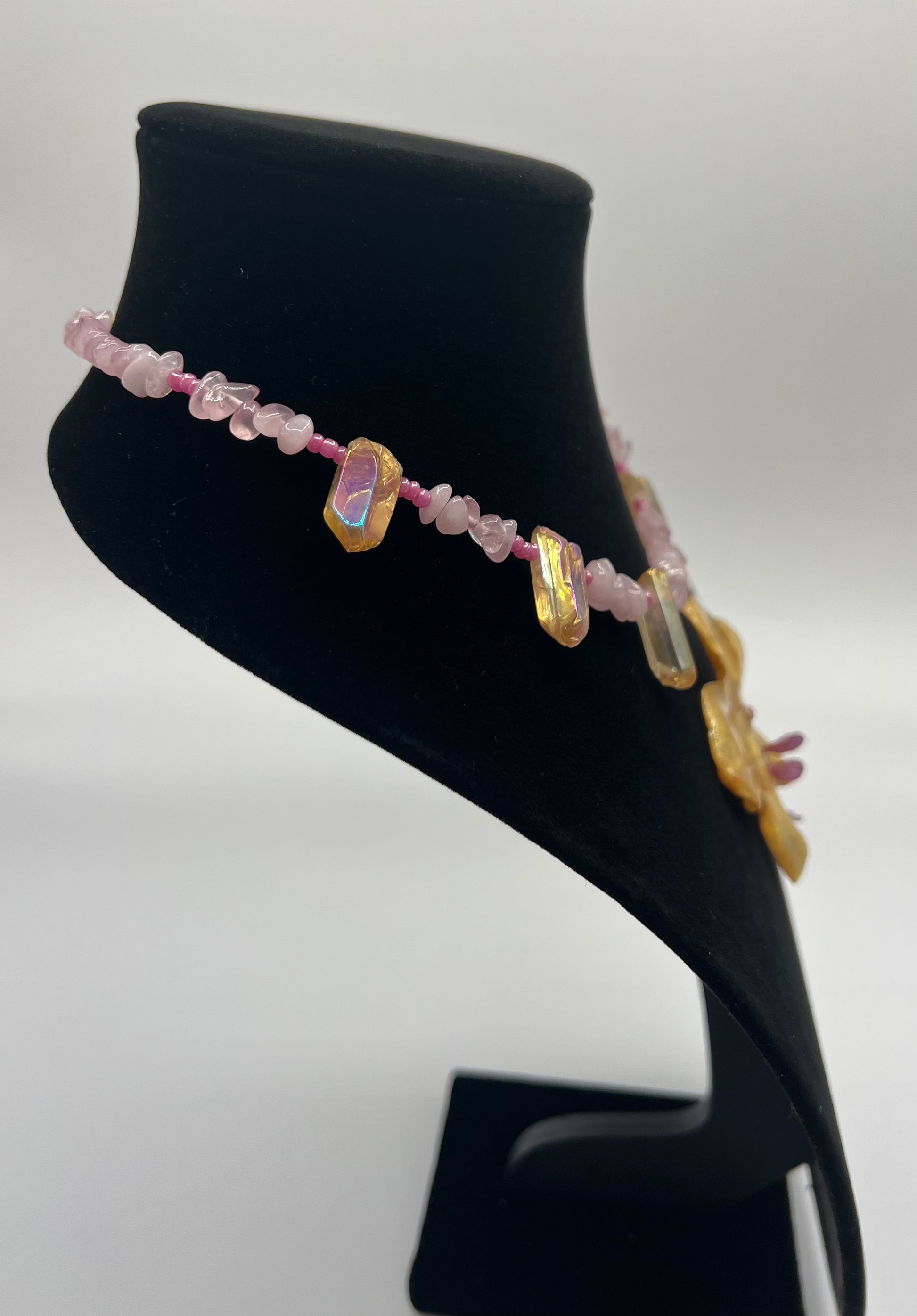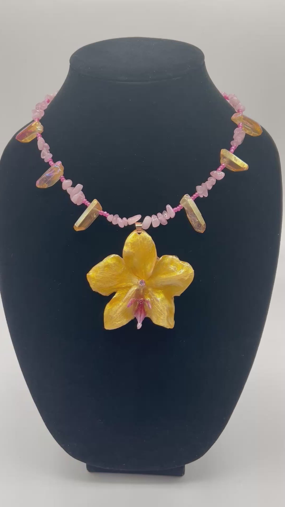 Handcrafted necklace with Rose quartz, dyed quartz, glass beads and a real encapsulated yellow orchid.