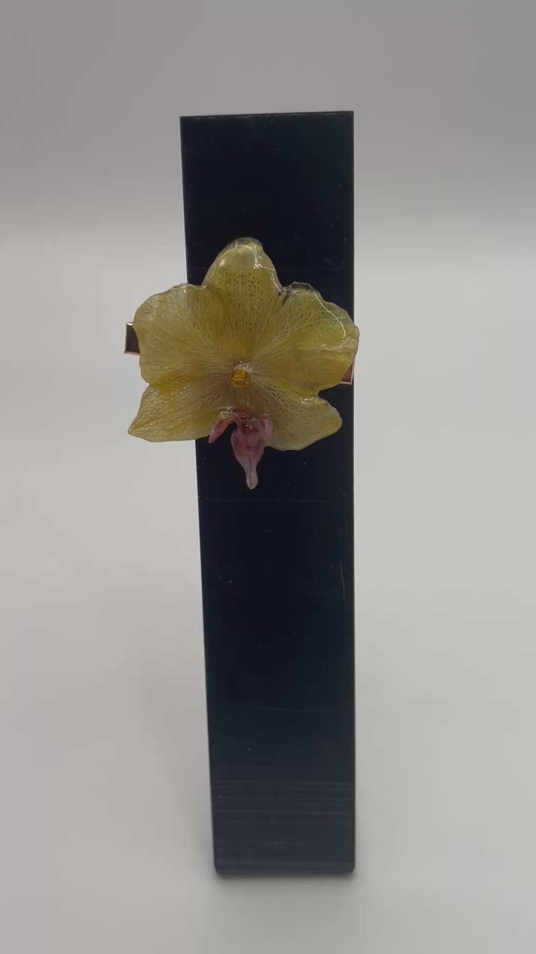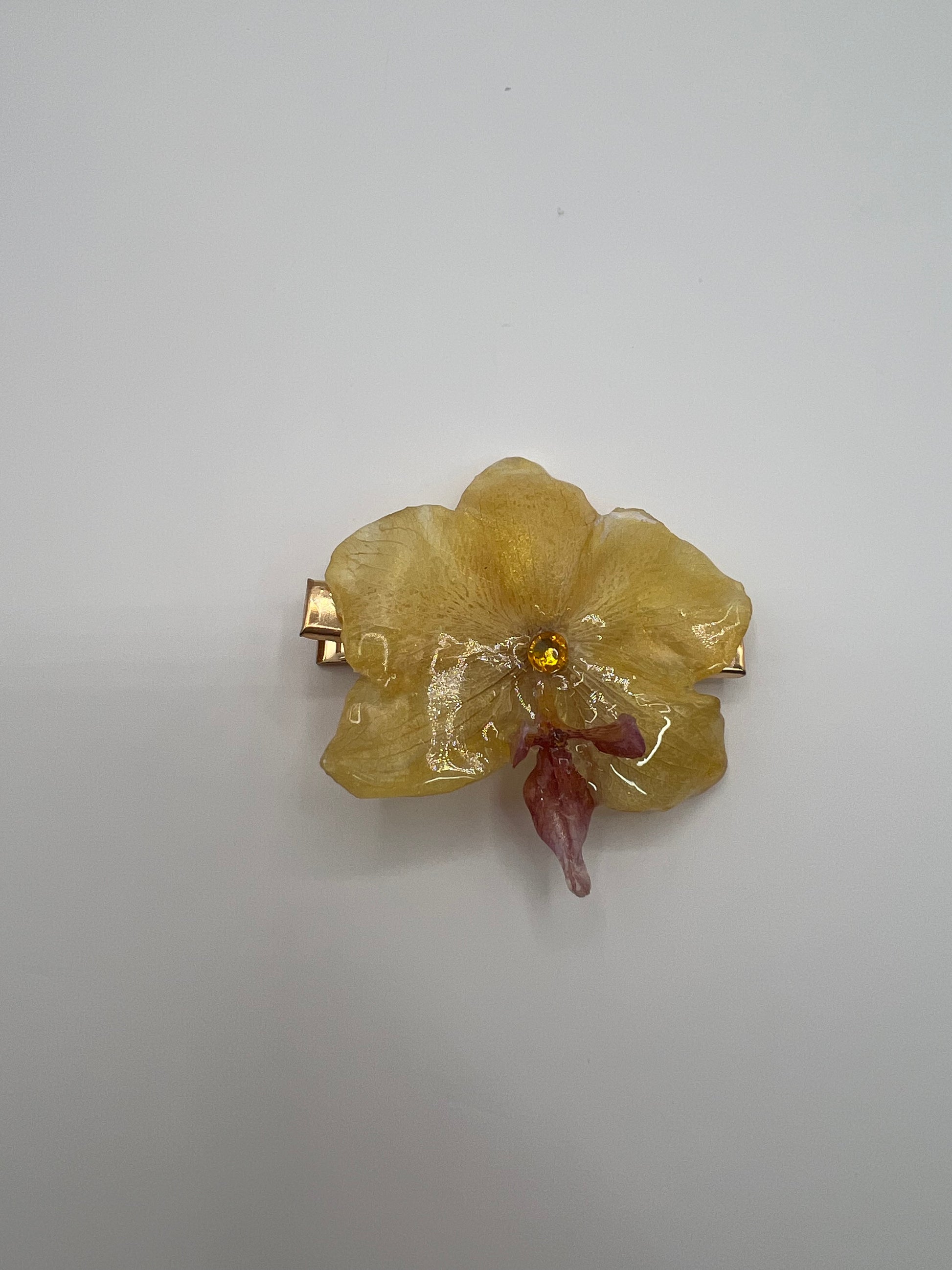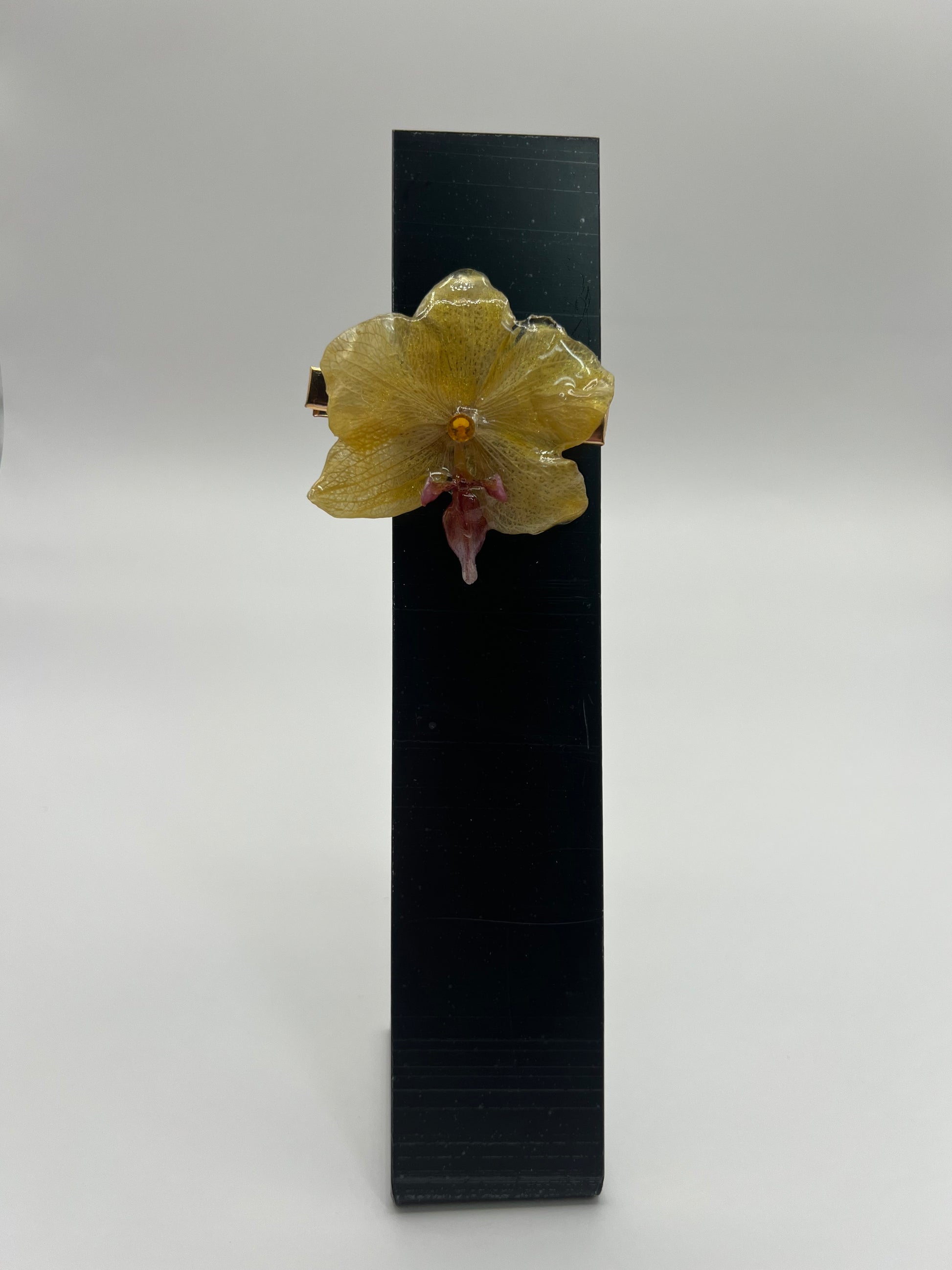 Yellow hair clip, made with real orchid encapsulated in resin.