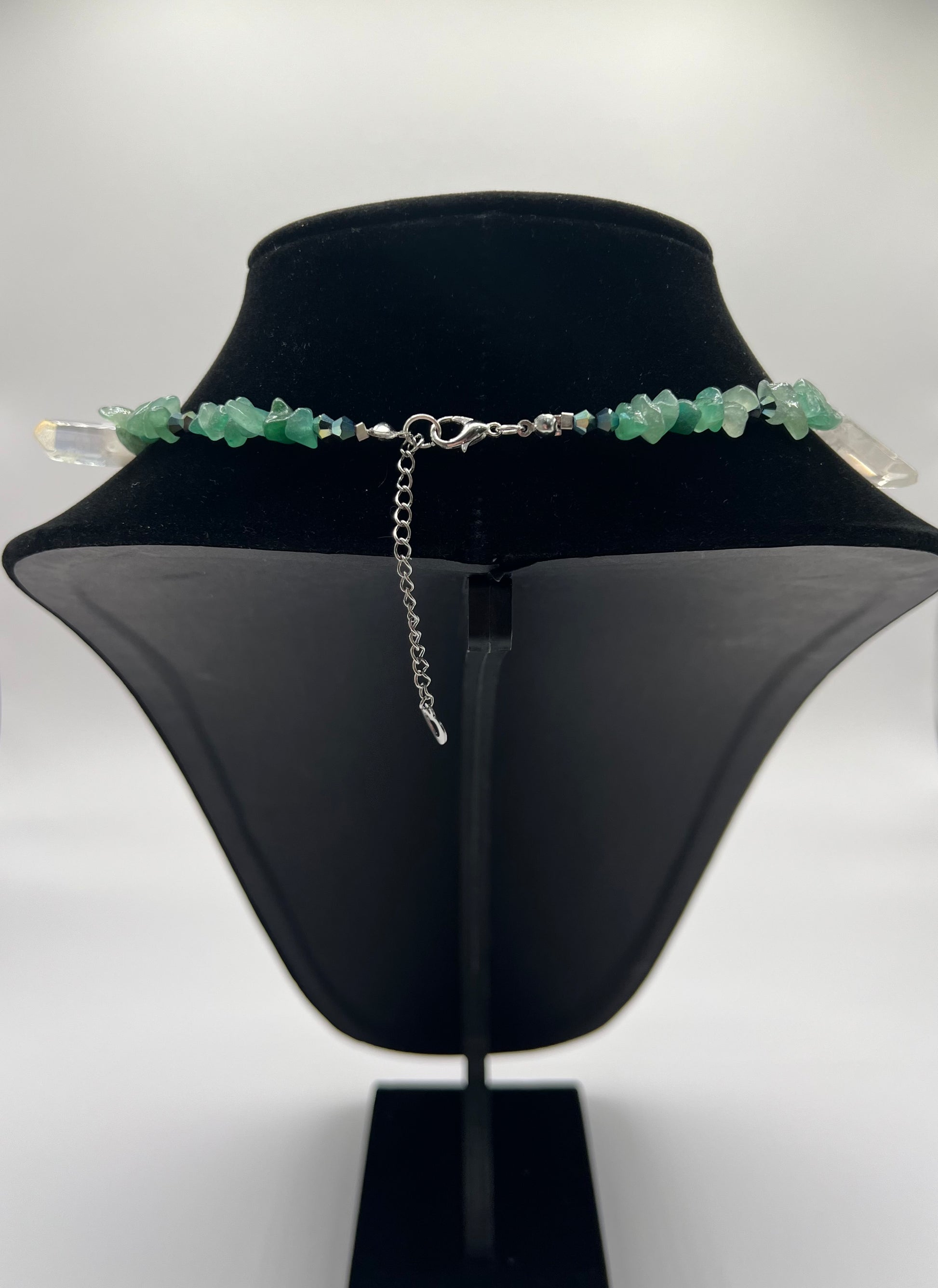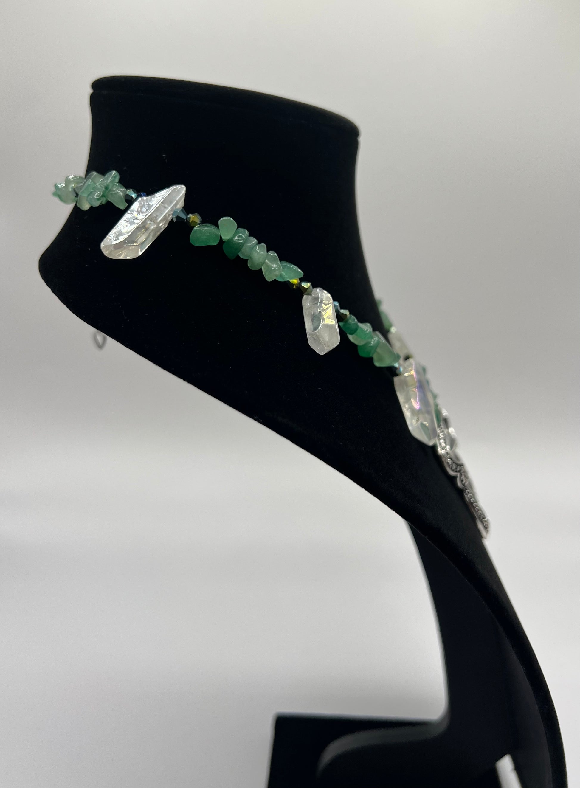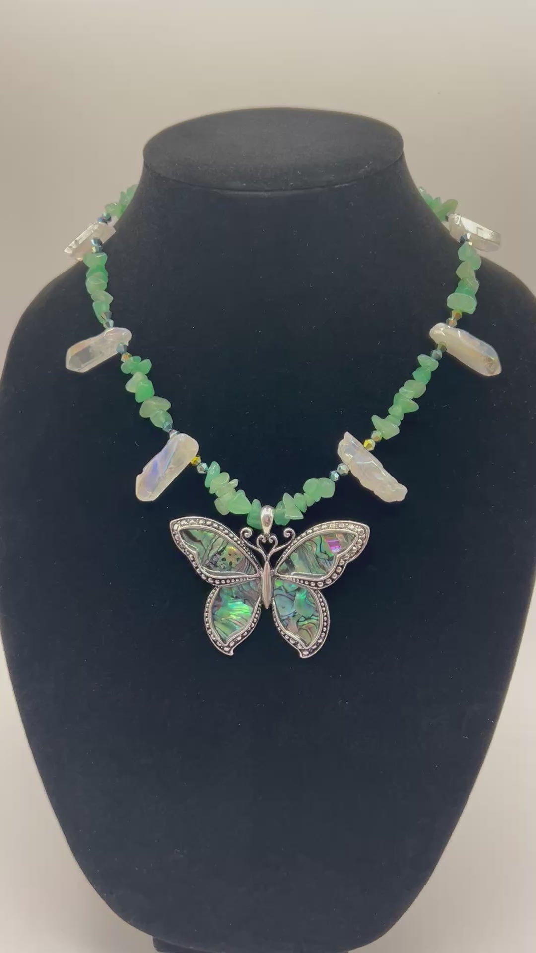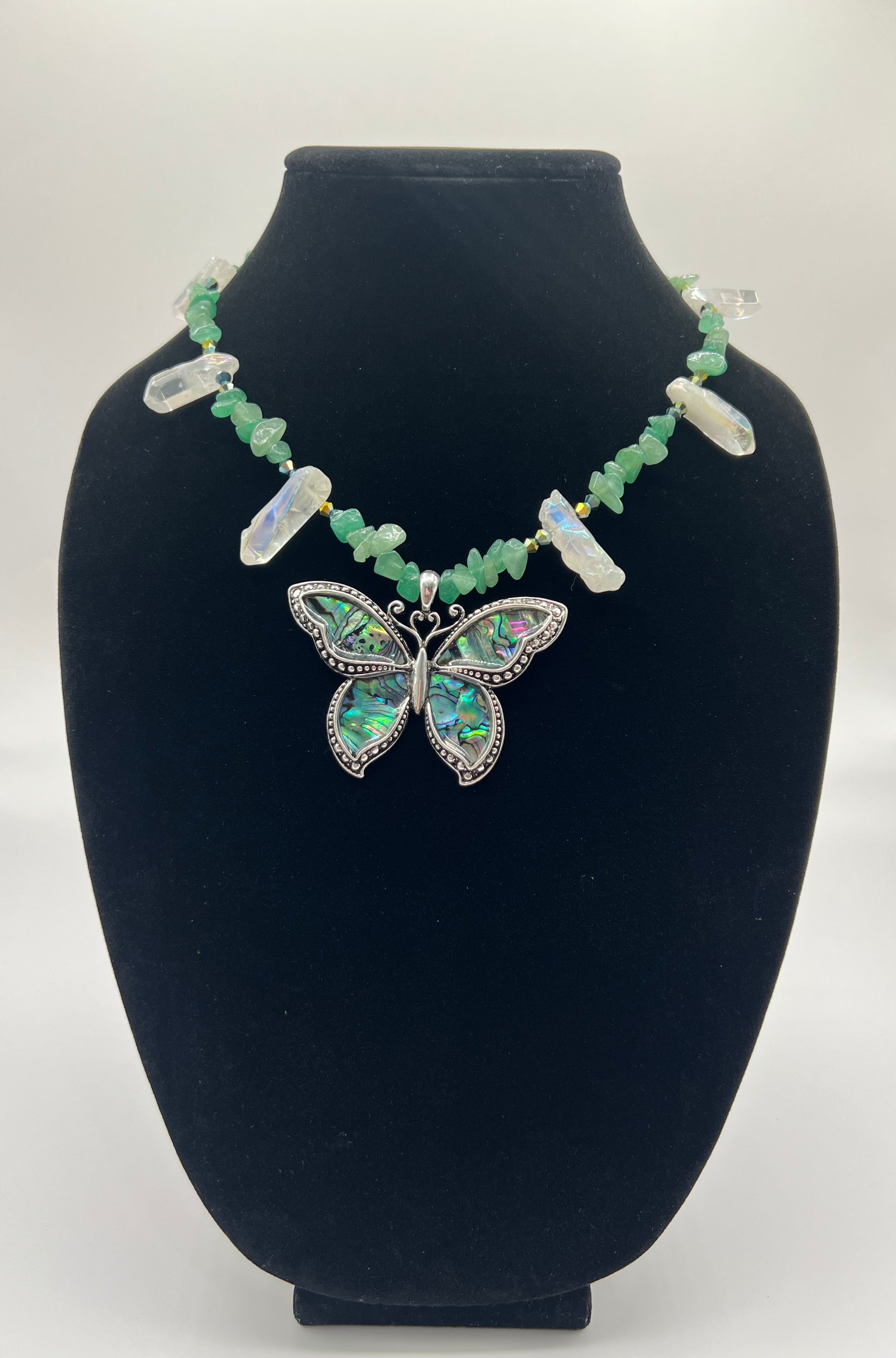 Handmade Necklace made of green Aventurine and White crystals, crystal beads and a butterfly pendant.